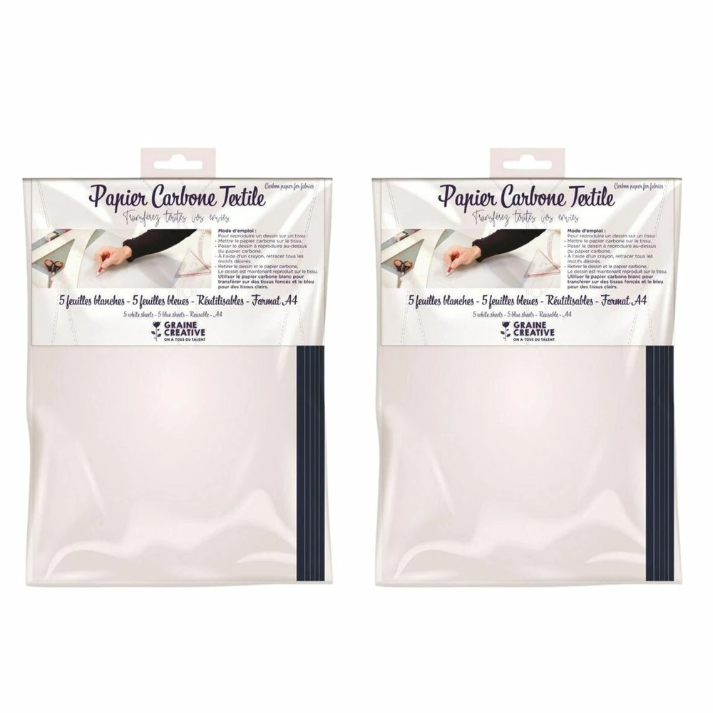 Grâce au papier carbone, transférez vos créations sur des tissus. Il suffit de poser le papier carbone sur le tissu souhaité. Posez le dessin à reproduire au-dessus du papier carbone. A l’aide d’un crayon, retracez tous les motifs désirés. Retirez le dessin et le papier carbone. Et voilà le tour est joué ! Taille a4. Contient 10 feuilles blanches et 10 feuilles bleues réutilisables. Utilisez le papier carbone blanc pour transférer sur des tissus foncés et le bleu pour des tissus clairs.