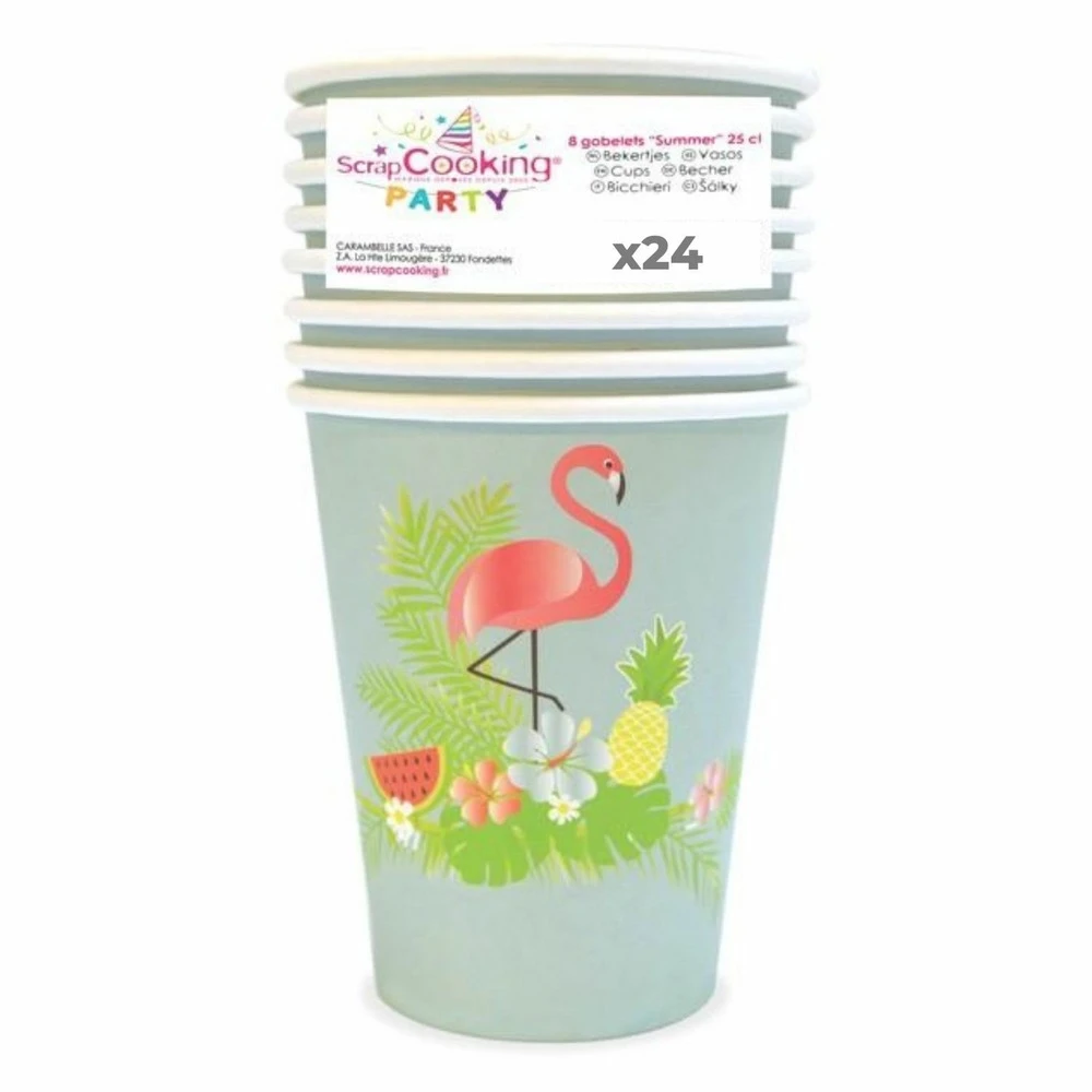 Pour vos fêtes et anniversaires sur le thème des tropiques, découvrez ces 24 gobelets en carton joliment décorées d’un flamant rose, de végétation et fruits exotiques sur un fond bleu pastel. Découvrez également les serviettes de la même série ainsi que les assiettes en carton summer.
