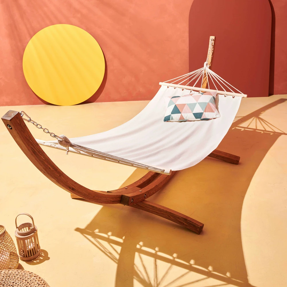 hamac sur pied en bois, facile à monter. Plus la peine de chercher deux arbres idéalement espacés pour vous offrir une bonne sieste. Grace à ce hamac sur pied, vous allez pouvoir vous laisser bercer dans votre jardin avec style. Bois clair et toile blanche : on aime son esprit doux et naturel qui s’intégrera à merveille dans un jardin. Le hamac peut supporter un poids de 100 kg. Le montage est facile (comptez une quinzaine de minutes), la notice et la visserie sont fournies.