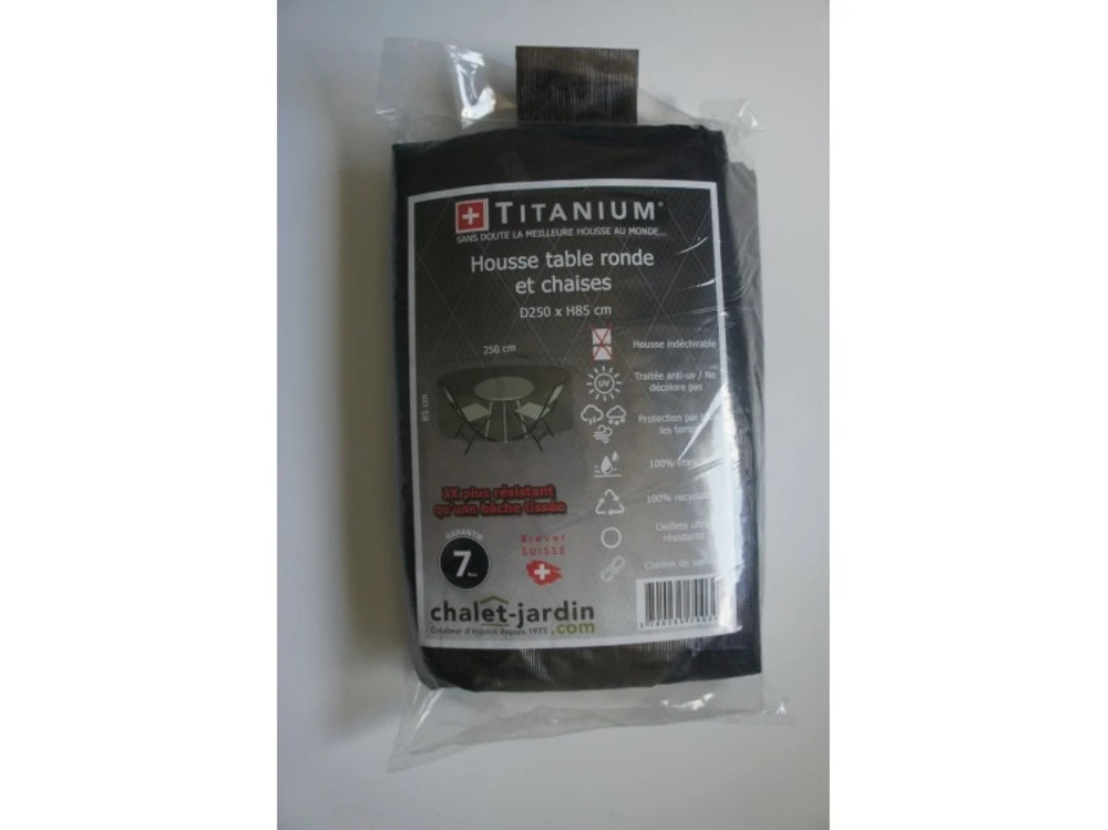 Techniquesdimensions ext. Hors tout (l x p x h) : 250 x 250 x 85 cmgrammage : 90 g/m ²matiã¨re : polyã©thylã¨necoloris : noir rayã© blancinclus : cordon de serrage ultra rã©sistantssouple et lã©gã¨re / 100 % recyclable / 100 % ã©tanche ã l’eau, ã la poussiã¨re et aux uv / rã©siste aux changements de tempã©ratures et ã de nombreux produits chimiques colis : dimensions colis : 40 x 30 x 40 cm poids unitaire : 1,280 kgcette housse de protection pour votre table rondes et vos chaises vous permettra de protã©ger votre mobilier en le gardant au sec et ã l’abri des intempã©ries. Cette housse de protection bã©nã©ficie d’un procã©dã© ultrasonique pour une meilleure rã©sistance, systã¨me brevetã© (suisse).avantages : ultra rã©sistant, technologique, opaque, traitã© pour une protection uv, pratique, ne nã©cessite aucun entretien