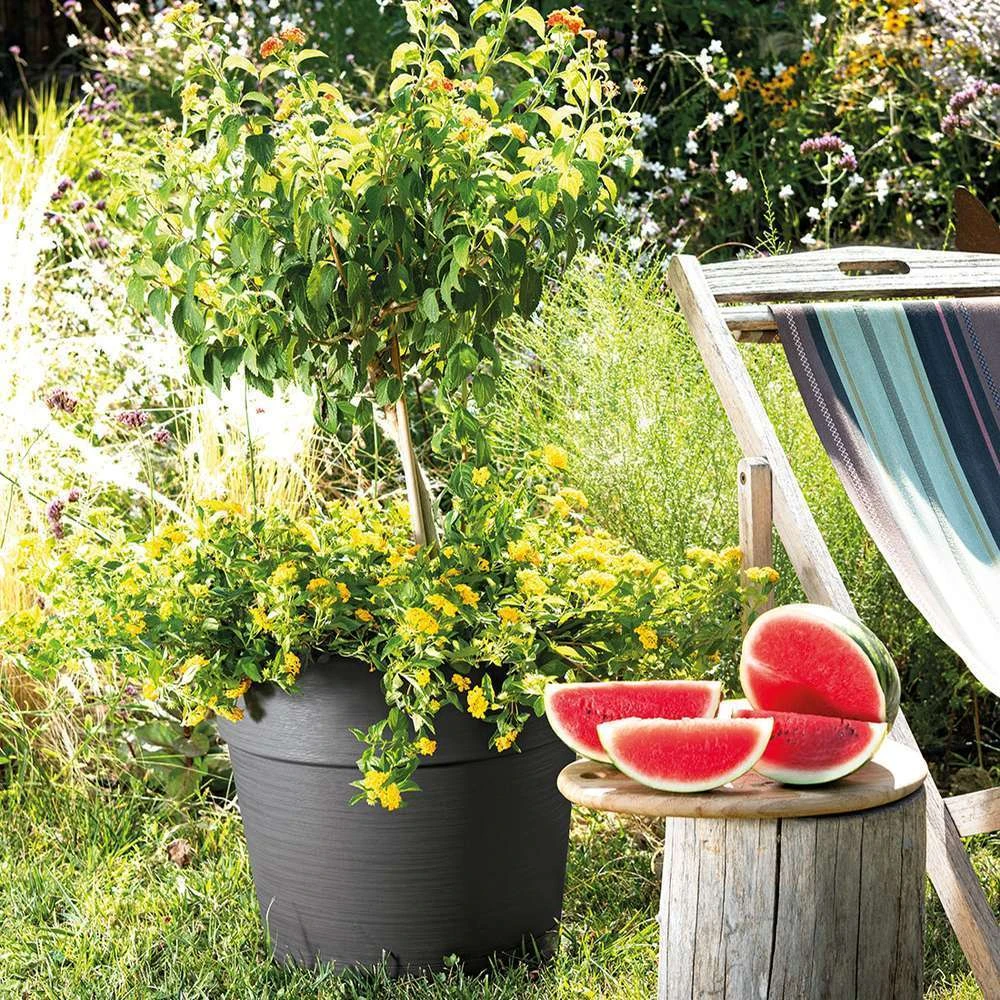 Ce pot Save R de couleur anthracite, présente un look sobre et moderne qui se fondera parfaitement avec tous les styles d’aménagement extérieur. 100% en matière recyclé et recyclable, il est résistant au gel et aux U.V. et vous garanti une longue tenue même en hiver. Disposant d’une réserve d’eau, ce cache-pot Save R sera votre allié pour prendre soin de vos fleurs et créer un véritable espace végétal sur votre terrasse. Dimensions : Ø28,8 x H. 26,2 cm.
