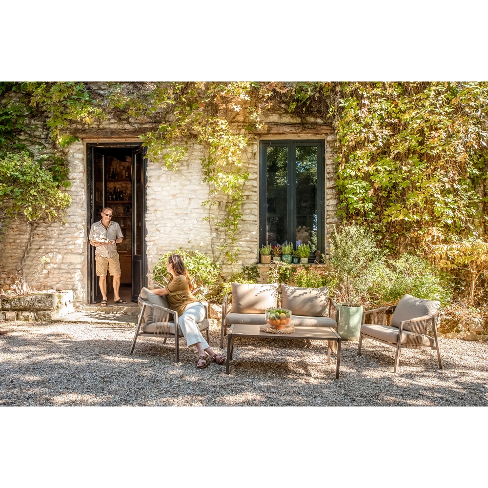 Avec le retour des beaux jours, vous allez enfin pouvoir prolonger vos soirées au jardin ou en terrasse en profitant de votre salon de jardin avec vos proches. Le salon de jardin bas de la superbe ligne HELIOS a été conçu afin d’inscrire vos extérieurs dans un esprit très chic et très tendance. Votre salon de jardin bas HELIOS est composé d’un canapé 2 places de dimensions L.151 x l.80 x H.69cm, de 2 fauteuils de dimensions L.80 x l.68 x H.69cm et d’une 1 table basse de dimensions L.116 x l.60 x H.40cm. Ses finitions haut de gamme en font un élément essentiel de vos extérieurs mais aussi de votre cocon domestique si vous souhaiter faire bénéficier votre intérieur de son caractère à la fois chic et authentique. Le salon de jardin HELIOS est un produit d’exception. Sa structure en aluminium et résine tressée, la superbe peinture à l’effet chêne du revêtement de ses armatures et le plateau teinté chêne lui aussi de sa table séduisent l’œil instantanément. Vous adorerez aussi le confort de ses coussins garnis d’une mousse d’une densité de 25 kg/m3. Votre salon de jardin HELIOS donnera à votre espace de détente privilégié une touche de distinction du plus bel effet. Salon de jardin bas ligne HELIOS en aluminium et acrylique 4 pièces.