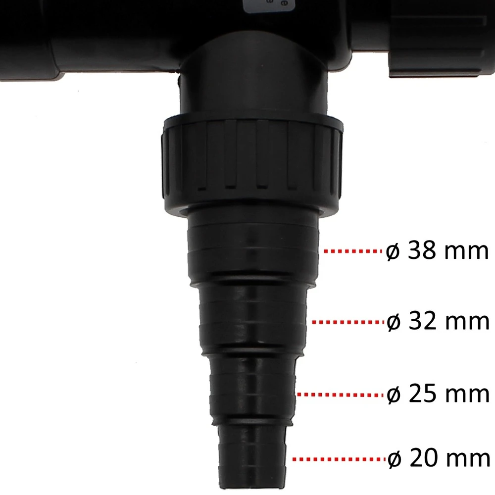 – diamètre de raccordement du tuyau : adaptable pour 20 mm (3/4′), 25 mm (1′), 32 mm (1 1/4′) et 38 mm (1 1/2′)
