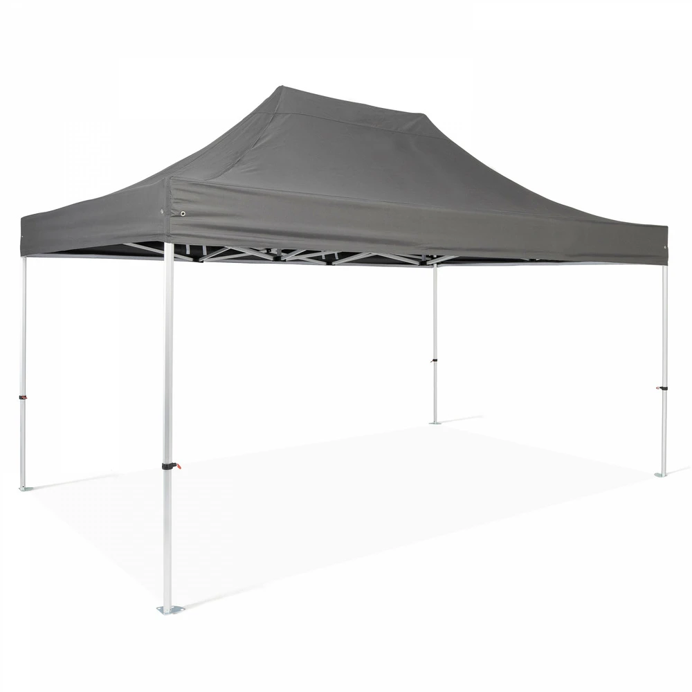 tente pliante 3×4,5m. Ce barnum pliant est idéal pour organiser vos réceptions ou pour protéger votre stand sur les marchés, brocantes… Sa structure en aluminium de section hexagonale 40mm lui garantit sa solidité pour un utilisation intensive. Son toit gris est en polyester enduit pvc 300 gr/m². Il est totalement imperméable et déperlant et ne craint pas les uv. Vous pourrez régler la hauteur de la tente pliable sur 5 positions. Votre tente de réception est livrée montée et dans son sac de transport à roulette. Vous aurez juste à la dépliée grâce à son système parapluie pour l’utiliser en moins de 3 minutes. Un kit d’haubanage pour sol meuble est inclus.