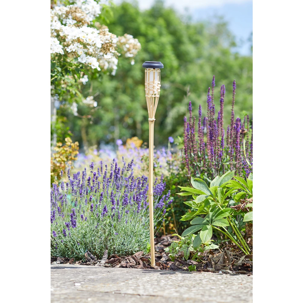 Torche solaire Bambou avec technologie Cool Flame pour un effet flamme vacillante rĂ©aliste et très branchĂ©, d’une couleur blanche chaude. Balise Ă planter le long des allĂ©es et bordures pour crĂ©er une atmosphère unique. Dimensions : L 8.5 l 8.5 H 91.5 cm